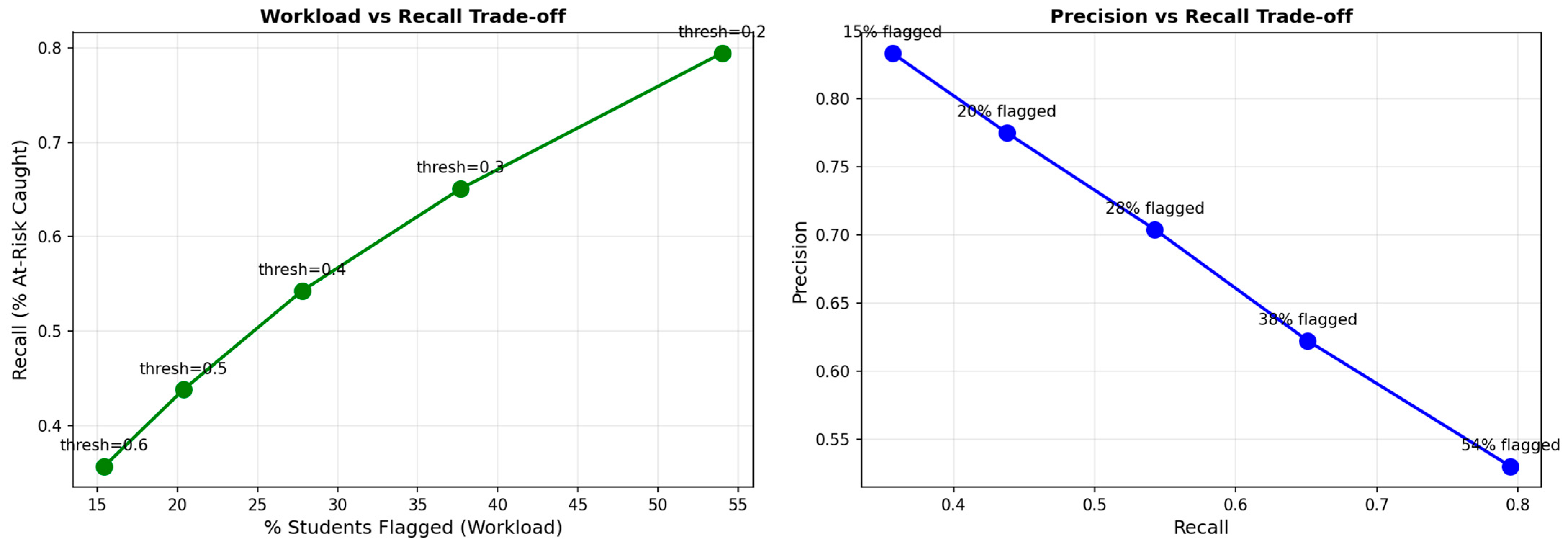 Figure 10 shows workload analysis for the gradient boosting model at five threshold values. The left panel plots recall (fraction of failing students caught) against percentage of students flagged. The relationship is roughly linear: to double recall, we must approximately double the alert list size. At threshold = 0.2, we flag 54% of students and catch 79% of failures. At threshold = 0.6, we flag only 15% of students but catch just 36% of failures. The right panel shows the classic precision–recall tradeoff, with workload percentages annotated at each point.