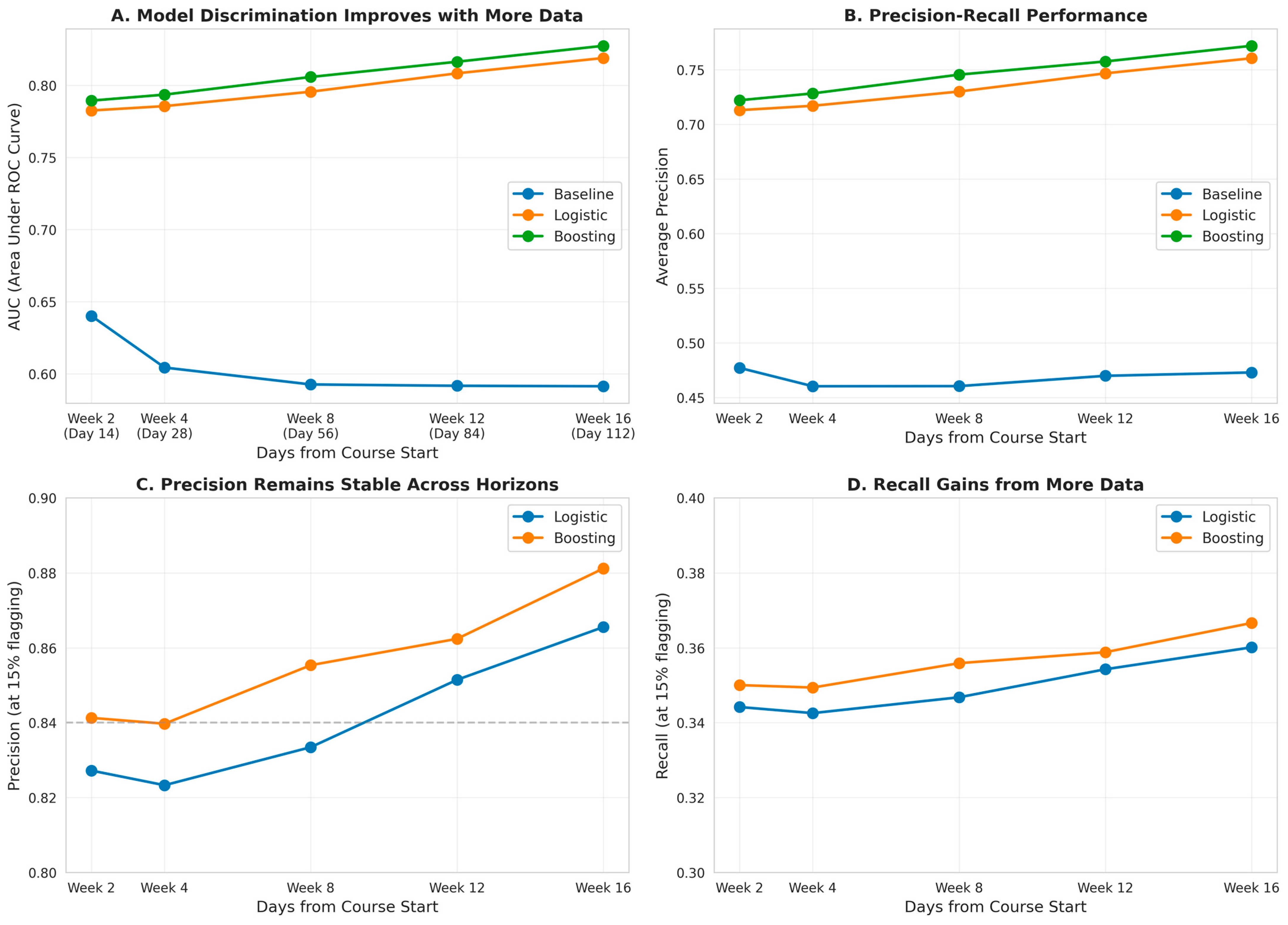 Figure 11 visualizes these dynamics across four dimensions. Panel A shows that machine learning models substantially outperform threshold rules at all horizons, with the gap widening slightly over time. Panel B confirms similar patterns in average precision, the preferred metric for imbalanced classification. Panels C and D reveal that precision remains high and stable while recall improves gradually, indicating that additional data primarily helps rank students more accurately rather than fundamentally changing who is identifiable as at-risk.