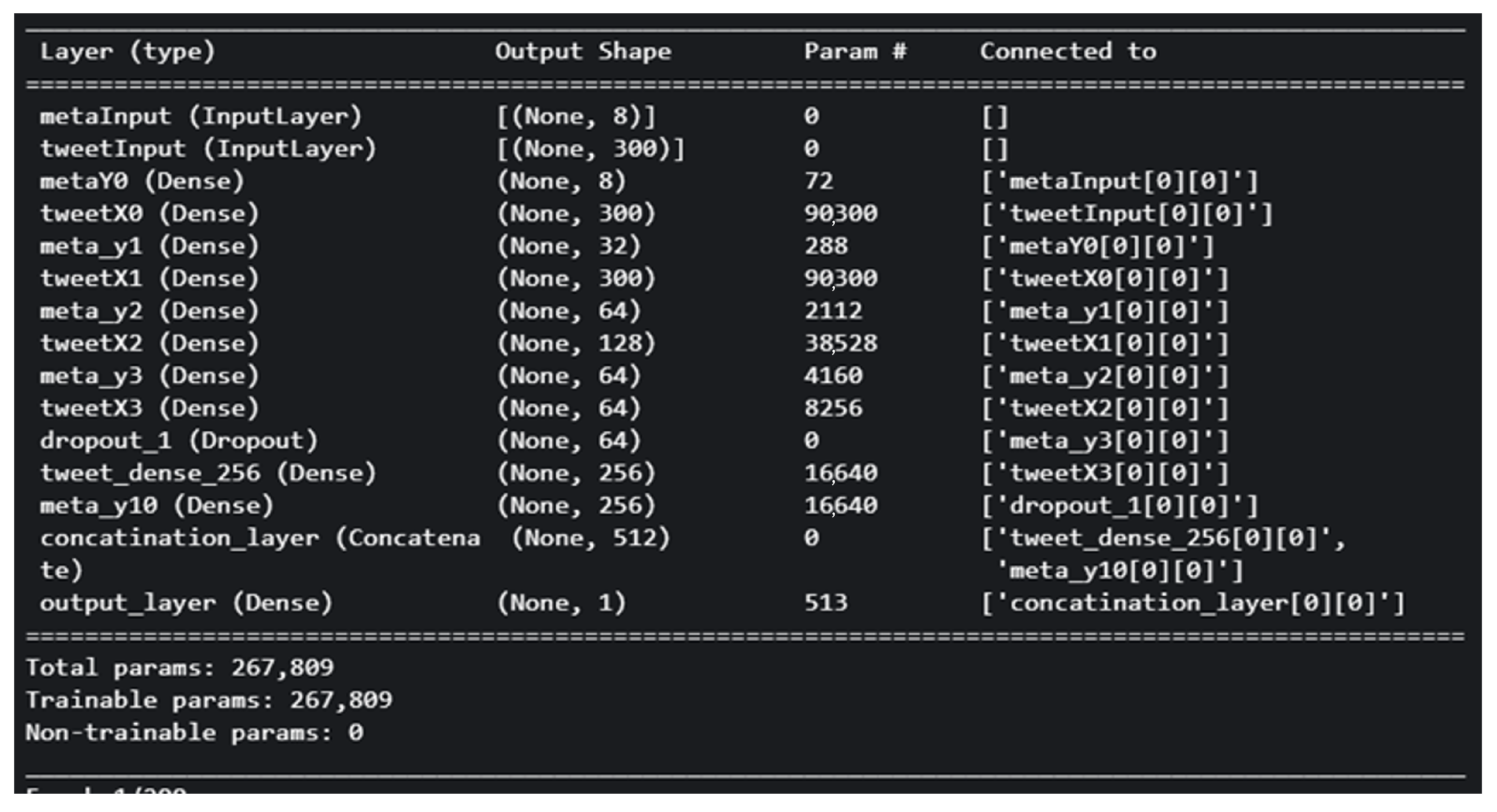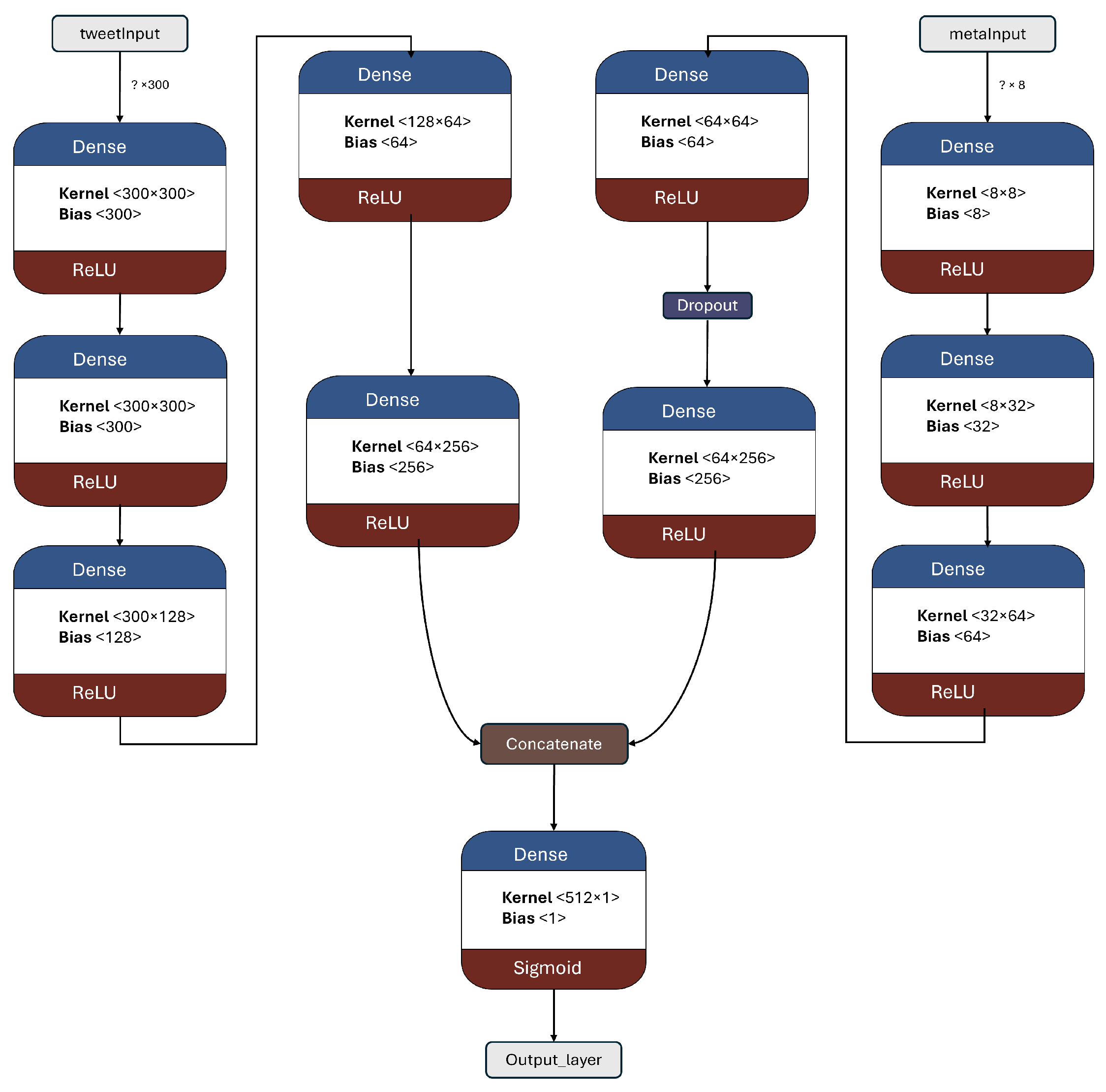 • Data Generation and Augmentation: In order to train and evaluate the two-branch DL model, two real-world Twitter datasets are collected, merged, and augmented. This step ensures a diverse and representative dataset for model training and testing.