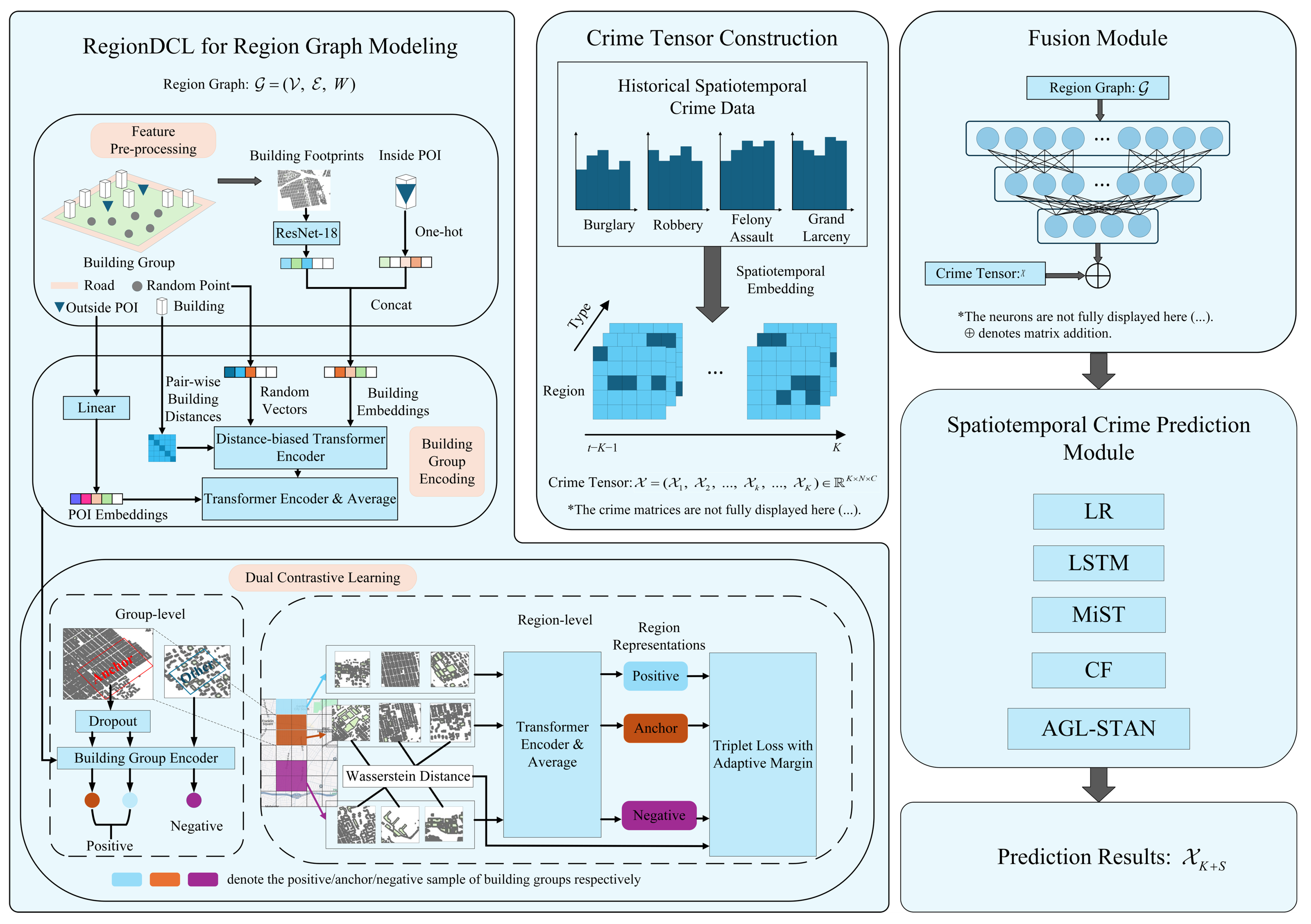 To address this gap, this paper applies building footprint data to characterize urban regions to construct spatial dependencies in crime spatiotemporal prediction models. Specially, we first fuse building footprints and POI data using Region Dual Contrastive Learning (RegionDCL) [