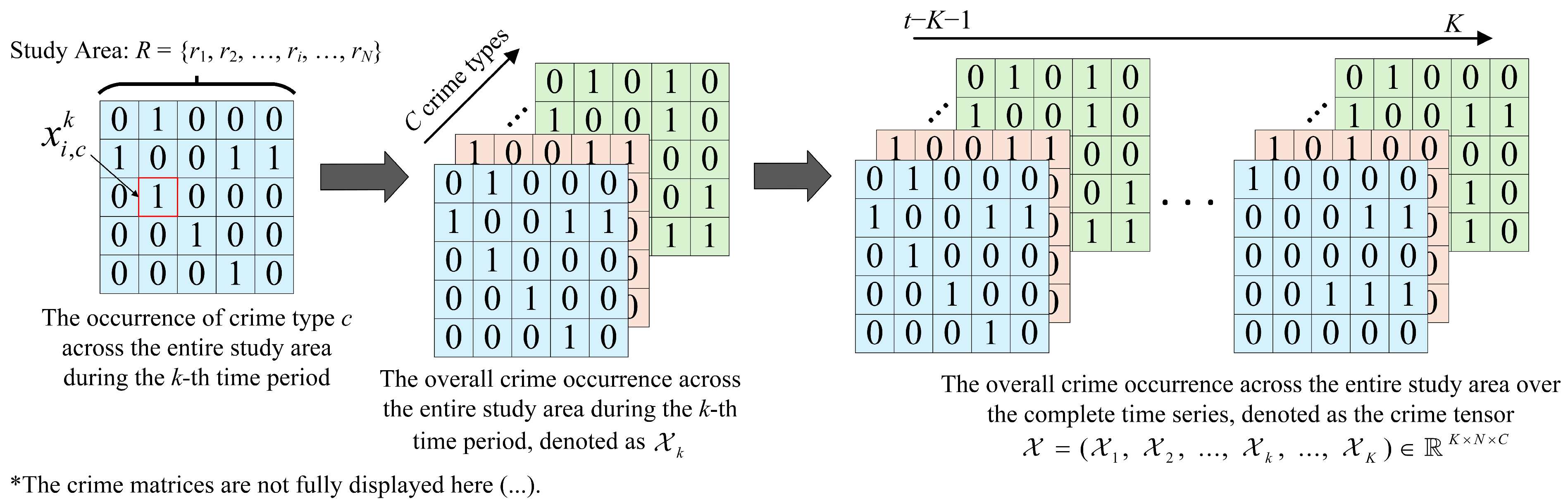 2]. Confronted with the complex evolution of criminal patterns, traditional passive-reactive governance models urgently require transformation into data-driven proactive early warning mechanisms. Crime spatiotemporal prediction refers to the analysis and modeling of implicit spatiotemporal distribution patterns from historical crime and related data, thereby effectively forecasting the time and location of future criminal activities [