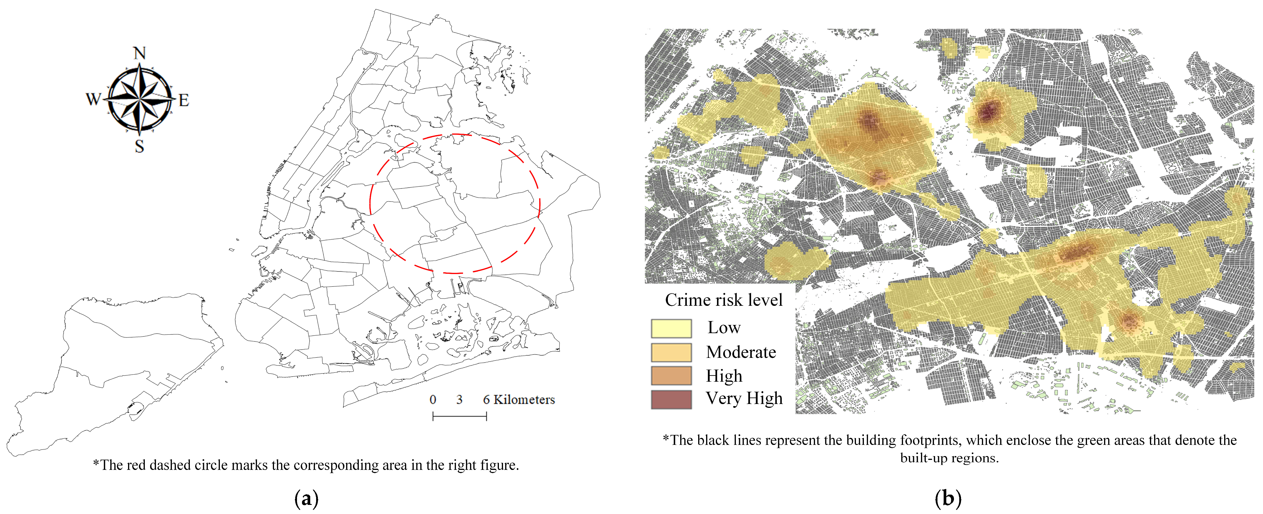 23]. As a result, POI data cannot fully capture the physical environmental decay characteristics central to Broken Windows Theory, the neighborhood spatial structural attributes highlighted by Social Disorganization Theory, or the spatial form control mechanisms relied upon in CPTED.