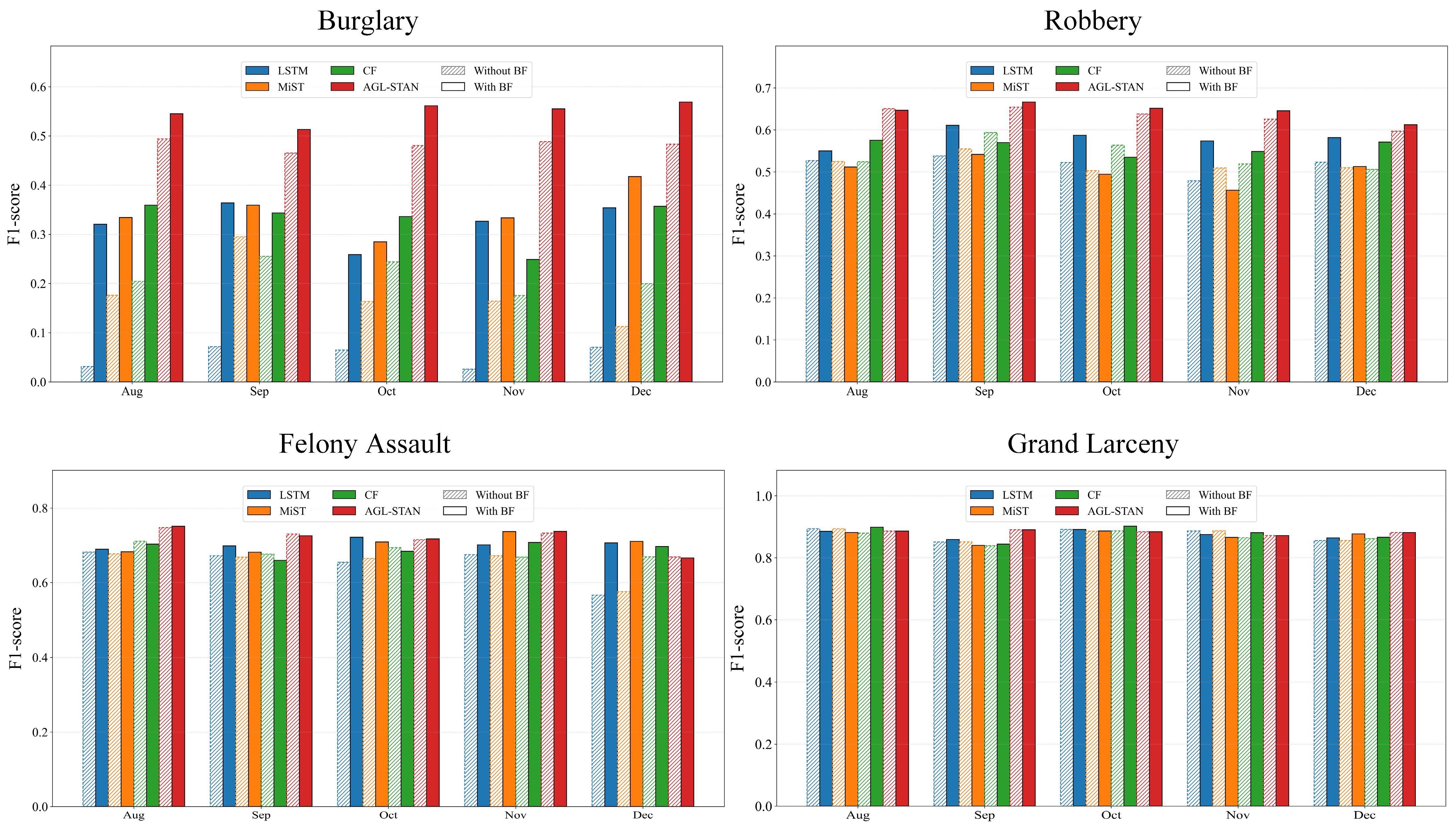 Robbery: After incorporating the region representations, LSTM shows consistent improvements in Robbery prediction. From August to December, F1-scores increase by 4.42%, 13.55%, 12.40%, 19.82%, and 11.18%, respectively, with a notable 19.82% improvement in November, validating the effectiveness of the region representations for long-term forecasting. The sustained 11.18% gain in December may be attributed to the region representations’ ability to capture spatial heterogeneity in street crimes, enhancing cross-temporal prediction robustness. AGL-STAN also records long-term improvements. However, MiST and CF exhibit unstable results: MiST’s attention mechanisms for spatial dependency modeling do not benefit from the region representations, while CF improves in August, November, and December but declines in September and October.