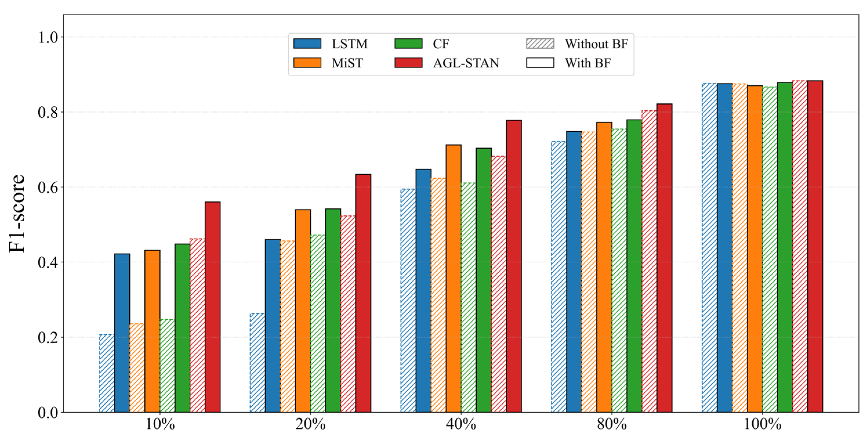 Figure 5, compellingly demonstrate that the benefit of the region representations is profoundly modulated by data sparsity. When the data is severely limited (e.g., at 10% and 20% sampling rates), the incorporation of BF provides a dramatic performance boost across all models. For instance, the F1-score of LSTM more than doubles at the 10% level with BF, transforming it from a weak predictor to a reasonably accurate one. This indicates that the rich spatial semantics from building footprints serve as a critical source of information, effectively compensating for the lack of training examples. As the volume of training data increases (to 40% and 80%), the relative advantage of BF gradually diminishes, though it continues to deliver consistent improvements. Finally, when the entire dataset (100%) is utilized, the models become sufficiently saturated with crime-specific data, and the marginal gain from the spatial prior provided by BF becomes negligible, as originally observed.