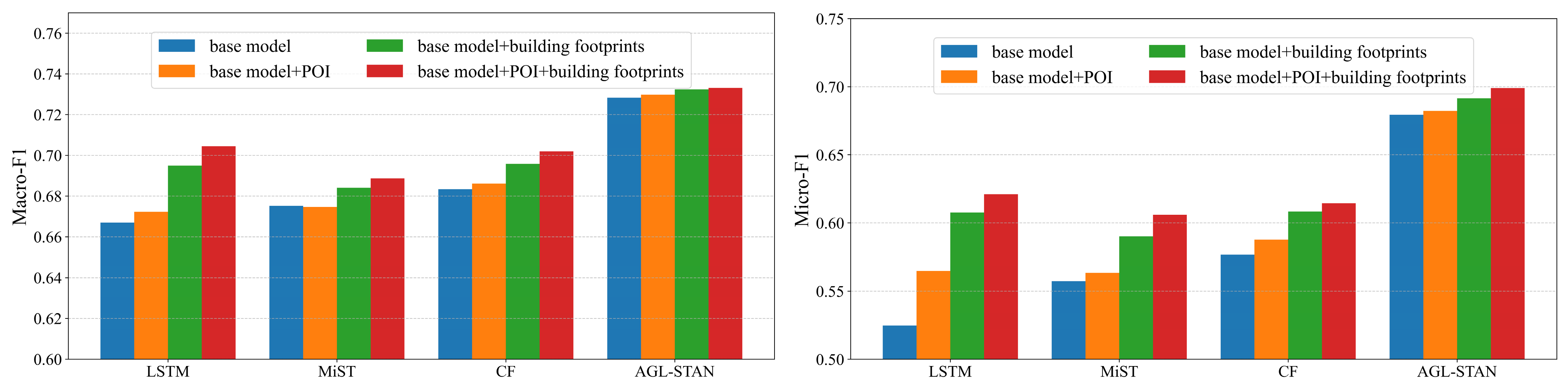 The experimental results of multi-class predictions demonstrate that the region representations significantly enhance the prediction performance of LSTM, MiST, CF, and AGL-STAN models, proving their universal enhancement effect across deep learning frameworks. These representations exhibit cross-model generalizability and deliver greater improvements for models with lower baseline accuracy. Specifically, the region representations show more pronounced enhancements for models lacking spatial dependency modeling, such as LSTM, MiST, and CF, highlighting their capacity to encode rich urban spatial semantics. For AGL-STAN, the integration of the region representations also improves prediction performance, indicating that the predefined graph derived from these representations effectively collaborates with adaptive graph learning. This underscores the complementary value of combining prior knowledge with data-driven approaches in spatial relationship modeling.