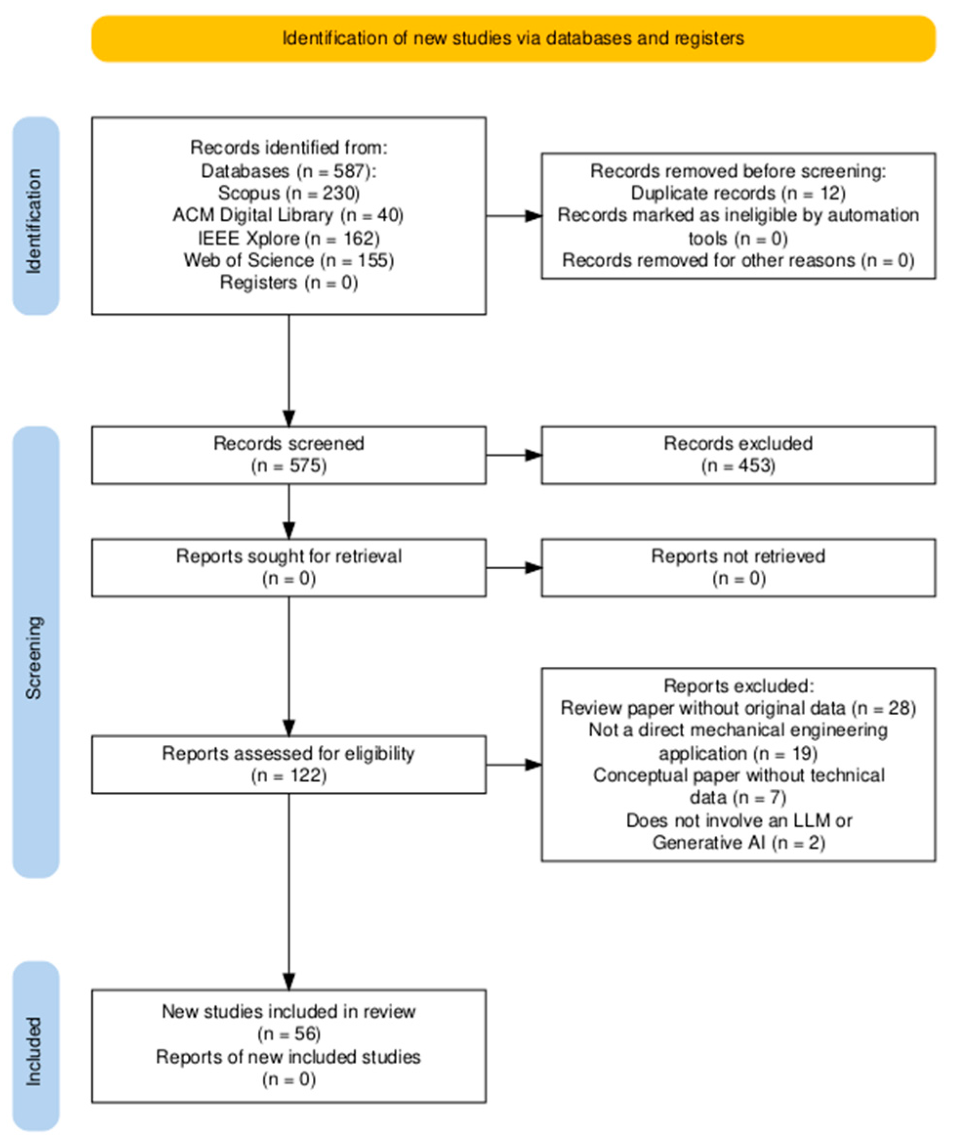 The search query was designed to be highly focused to precisely identify studies at the intersection of three core concepts: (A) Large Language Model technologies, (B) the mechanical engineering domain, and (C) specific engineering applications and tools. The search query, adapted for the syntax of each database, is detailed in Table 1. The search was applied to the titles, abstracts, and keywords of records published between January 2020 and the date of the search. An initial exploratory search of the arXiv preprint server was also performed; however, due to significant technical challenges with the platform’s export functionality that prevented a systematic and reproducible export of the results, a pragmatic decision was made to exclude this source from the final analysis to ensure methodological consistency.