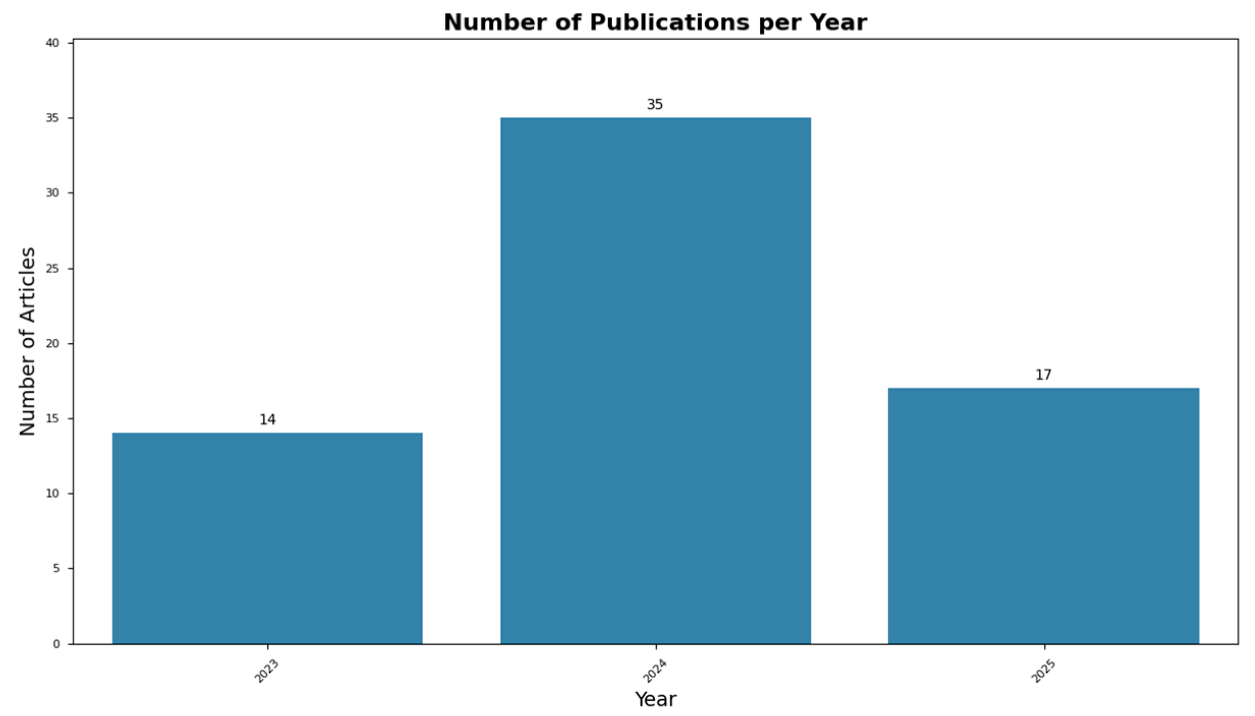 Figure 2. Distribution of Publications by Year. The number of included studies published annually (2020–2025), showing the field’s rapid acceleration with over 68% of papers from 2024.