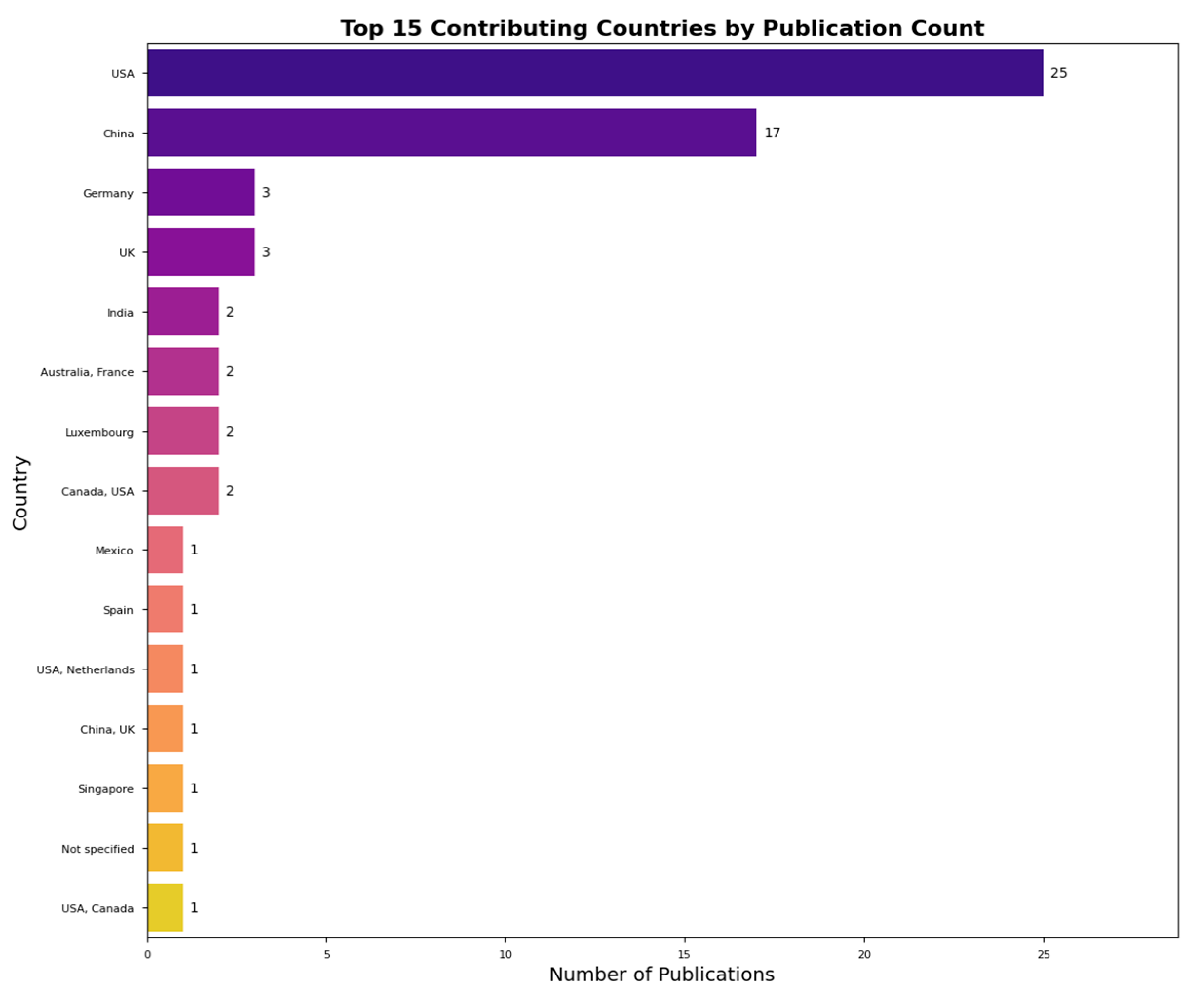 Figure 4. Geographical Distribution of Publications. The country of origin for included studies, highlighting the concentration of research in the United States and China.