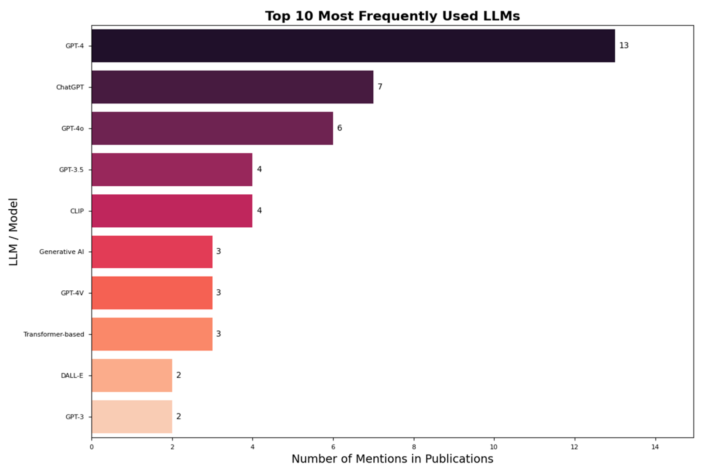 Figure 5. Frequency of LLM Models Cited. The number of studies utilizing specific LLM families, underscoring the dominance of OpenAI’s GPT models.