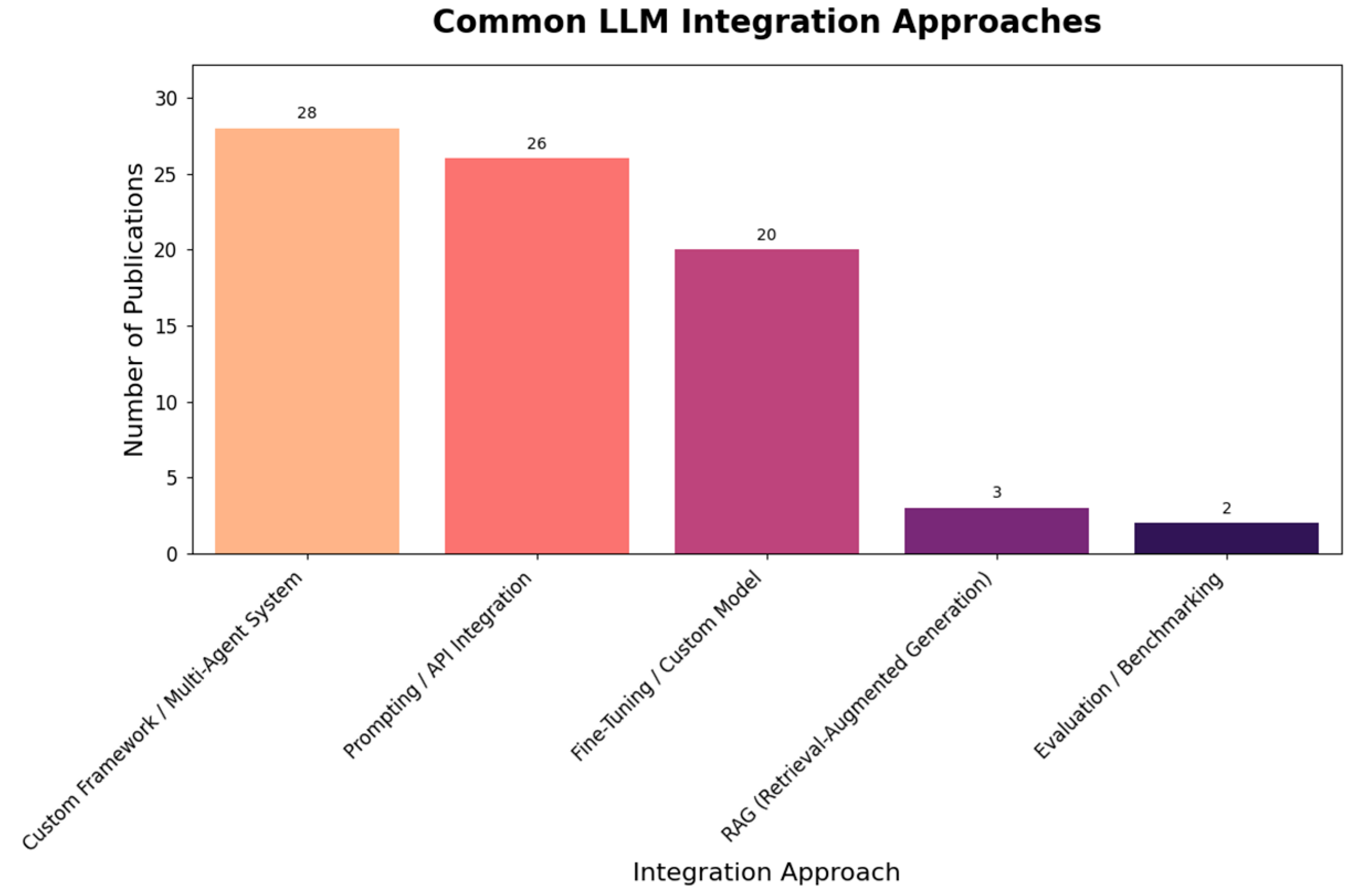Figure 7. LLM Integration Approaches. The technical methods used to implement LLMs, showing a prevalence of API-based prompting alongside the development of custom frameworks.