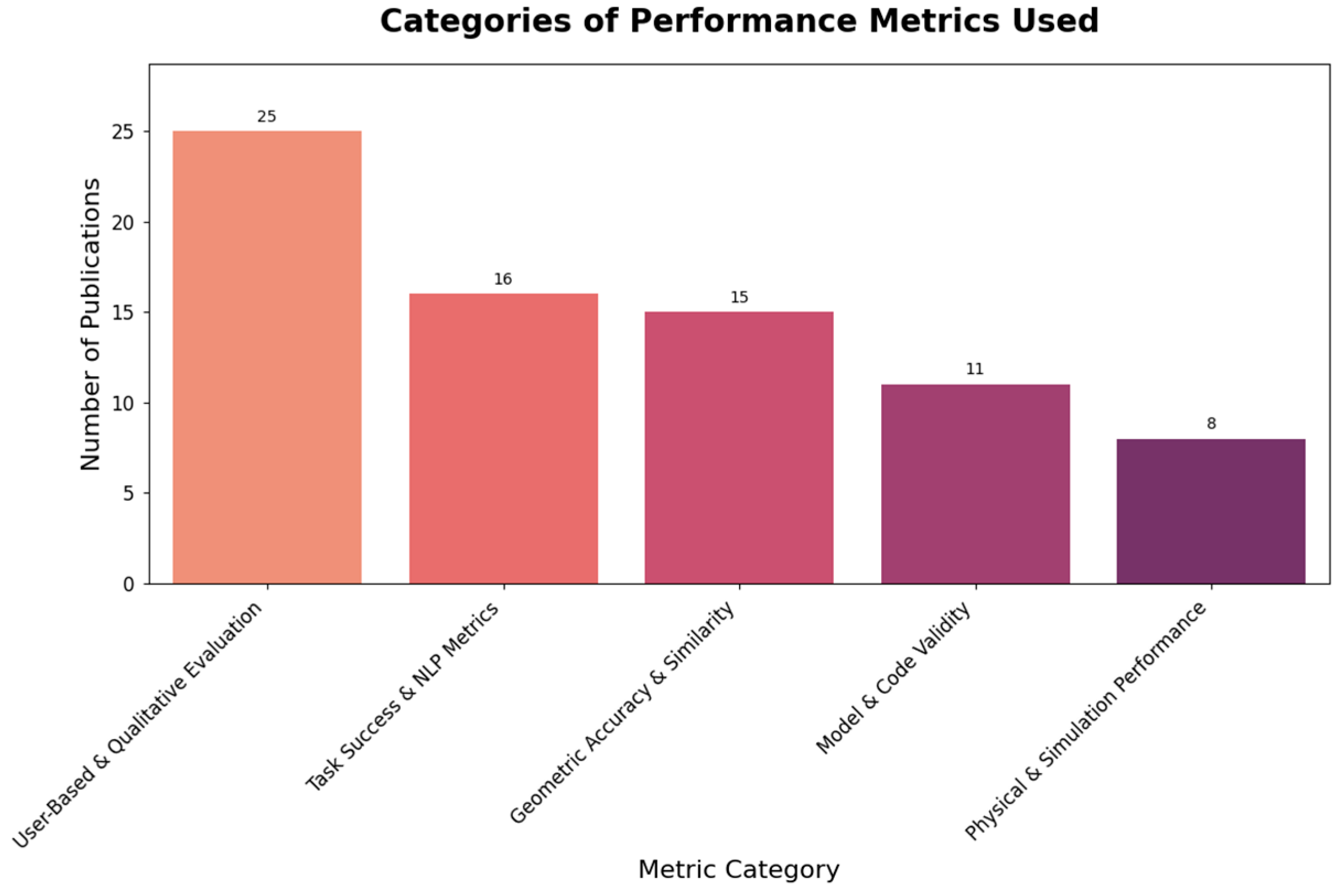 Figure 9. Evaluation Metric Categories. The types of performance metrics used to evaluate LLM-based systems, with Geometric Accuracy & Similarity being the most frequent.