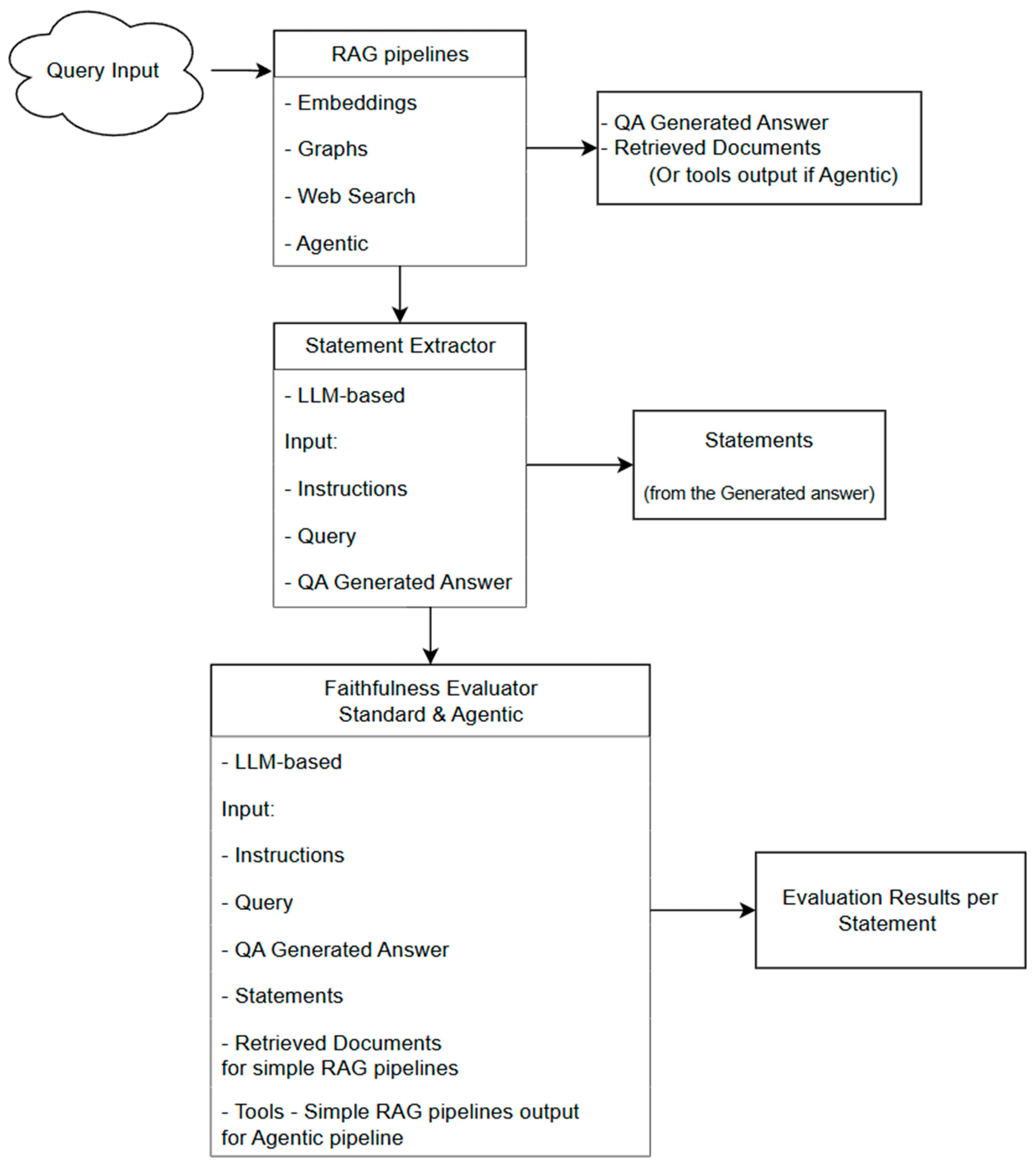 This study investigates the intersection of these architectures by focusing on statement-level hallucination detection and tool-specific attribution within both simple and agentic systems. By leveraging LLM-based evaluation frameworks, we aim to improve transparency, faithfulness, and trustworthiness of complex QA pipelines across structured domains.