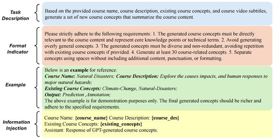 To generate course-level concept information, following our previous work [12], we utilize LLMs to produce structured semantic concepts based on course-related input. This process is guided by a prompt design that systematically instructs the LLM on the generation task. As illustrated in Figure 2, each prompt for both datasets is composed of three components: task description, format indicator, and information injection.