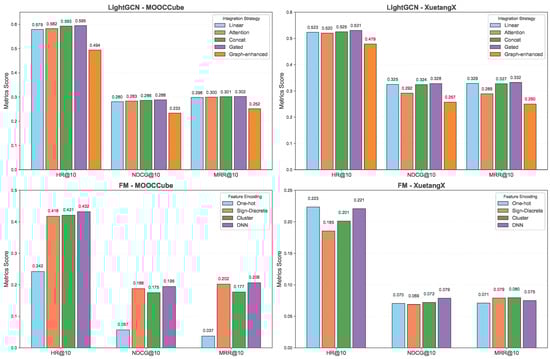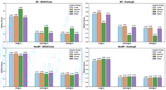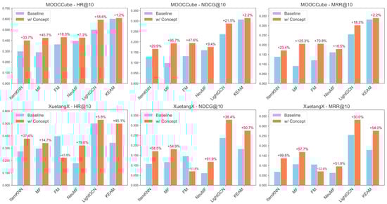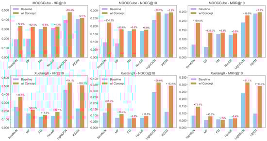 First, we examine the differences between the two datasets in terms of cold-start severity and observed gains. MOOCCube represents a moderate cold-start scenario, with users having ≤5 interactions, while XuetangX presents a more extreme case, limiting user histories to ≤3 interactions. Despite these challenges, our framework demonstrates remarkable adaptability. On MOOCCube, all models benefit from concept integration, with consistent performance improvements across metrics and top-K values. Notably, models such as MF and LightGCN achieve substantial gains, e.g., MF improves HR@10 from 0.1996 to 0.3242 and MRR@10 from 0.0577 to 0.1356. On the more challenging XuetangX dataset, the improvements remain robust, especially for models capable of flexibly leveraging semantic information. For instance, LightGCN increases HR@10 from 0.4565 to 0.5437, while KEAM jumps from 0.2317 to 0.5103. These findings highlight the strong generalization ability of our framework, even when only minimal contextual information (e.g., course titles) is available. Second, we analyze how different model types benefit from LLM-generated concepts under the cold-start scenario. Traditional collaborative filtering models like ItemCF and MF exhibit the most pronounced relative improvements. For example, ItemCF’s NDCG@10 improves by +130.5% on MOOCCube and +61.0% on XuetangX, showing that even simple models can greatly benefit from external semantic signals. On the other hand, models such as NeuMF and LightGCN also show measurable but more moderate improvements, as they already capture complex user–item interactions internally. Importantly, the performance of FM deserves closer attention. Unlike in Section 5.1, where FM shows stable gains on MOOCCube, in the XuetangX cold-start setting, FM’s performance drops after incorporating concept embeddings (e.g., MRR@10 from 0.0590 to 0.0546). This counterintuitive result is likely due to the lack of rich contextual signals in XuetangX and the FM model’s reliance on concatenation-based fusion, which may introduce noise when concept signals are limited or overly redundant. Third, comparing cold-start results to those in Section 5.1 under general settings, we find both similarities and distinctions. In both cases, concept integration consistently improves performance, confirming the utility of semantic enrichment. However, the gains are often more pronounced in cold-start scenarios, particularly for models originally hampered by sparse interaction data. MF, for instance, exhibits a relative improvement of over +60% in HR@10 under cold-start, compared to a smaller gain under full data settings. This indicates that the impact of concept information is magnified when behavioral signals are scarce, further reinforcing the value of our augmentation strategy in sparse recommendation environments.