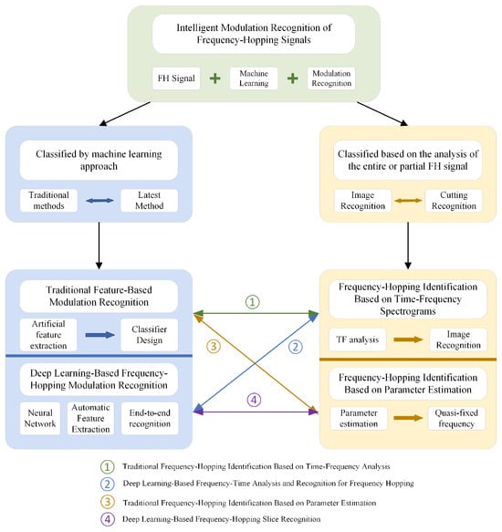 The intelligent modulation recognition methods for frequency-hopping signals can be categorised into two types based on whether slicing processing is applied, as follows: time–frequency analysis-based frequency-hopping signal modulation recognition methods and parameter estimation-based frequency-hopping signal modulation recognition methods.