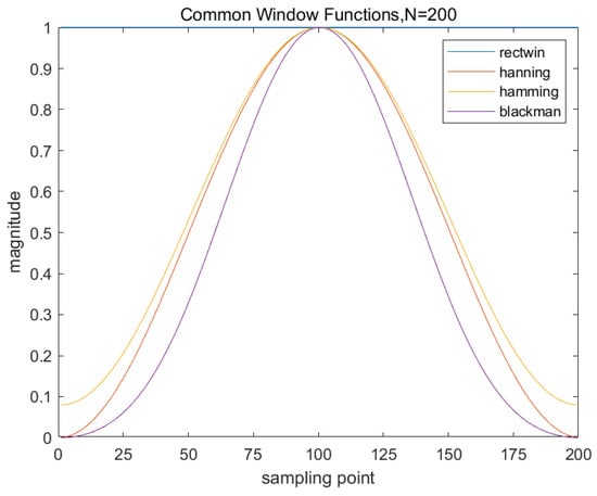 In the Equation (6), represents the frequency-hopping signal, and denotes the complex conjugate of the window function. The primary function of window functions is to constrain the analysis range of the signal before the Fourier transform and optimise its spectral characteristics. Common window functions include the rectangular window, Hanning window, Hamming window, and Blackman window. As shown in Figure 7, we compared the time-domain waveforms of different window functions. Each window function exhibits distinct characteristics in frequency resolution and side-lobe suppression performance. The main lobe width and side-lobe height directly influence frequency resolution and spectral leakage suppression effectiveness. Therefore, window functions should be selected appropriately based on specific application requirements to achieve the optimal balance between resolution and suppression performance.