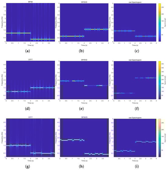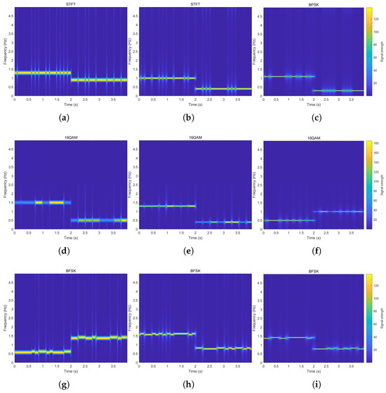 Comparison of several time–frequency analysis methods for frequency-hopping signals. (a) STFT_BPSK; (b) SPWVD_BPSK; (c) CWD_BPSK; (d) STFT_16QAM; (e) SPWVD_16QAM; (f) CWD_16QAM; (g) STFT_ BFSK; (h) SPWVD_ BFSK; (i) CWD_ BFSK.