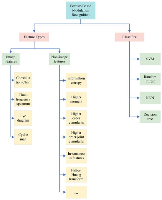 With the continuous advancement of science and technology, signal modulation recognition is progressively moving toward intelligent solutions. Its core task is to automatically determine the modulation scheme employed in a received signal without requiring human intervention or predefined conditions. To achieve this goal, it is typically necessary to conduct an in-depth analysis of the signal’s time domain, frequency domain, and other higher-order statistical features. This analysis is combined with advanced technologies, including machine learning, deep learning, and pattern recognition, to enable the autonomous and highly accurate identification of modulation types. To date, intelligent modulation recognition methods for frequency-hopping signals can be broadly categorised into two main types: traditional intelligent modulation recognition methods and deep learning-based intelligent modulation recognition methods. Traditional intelligent modulation recognition methods are primarily divided into two kinds: likelihood-based approaches and feature extraction-based approaches. Due to the rapid frequency changes and high uncertainty inherent in frequency-hopping signals, the computational complexity of Likelihood-Based Methods is significantly increased. Consequently, researchers often favour feature extraction techniques, which simplify the problem and enhance recognition efficiency by extracting key signal characteristics. Feature-based modulation recognition does not require complex, rigorous likelihood functions. Instead, it focuses on extracting representative features of the signal to be identified—such as I/Q sequences, amplitude, phase, higher-order moments, and constellation diagrams—and then classifying the signal using specific classifiers based on different feature information. Standard classifiers include decision trees, k-nearest neighbors, and support vector machines (SVMs). We summarise the commonly used signal features and classifiers in Figure 10. These methods are used widely due to their low computational complexity and high recognition accuracy, which improve the efficiency of the operation in modulation recognition. The algorithmic flow for feature-based modulation recognition is illustrated in Figure 11.