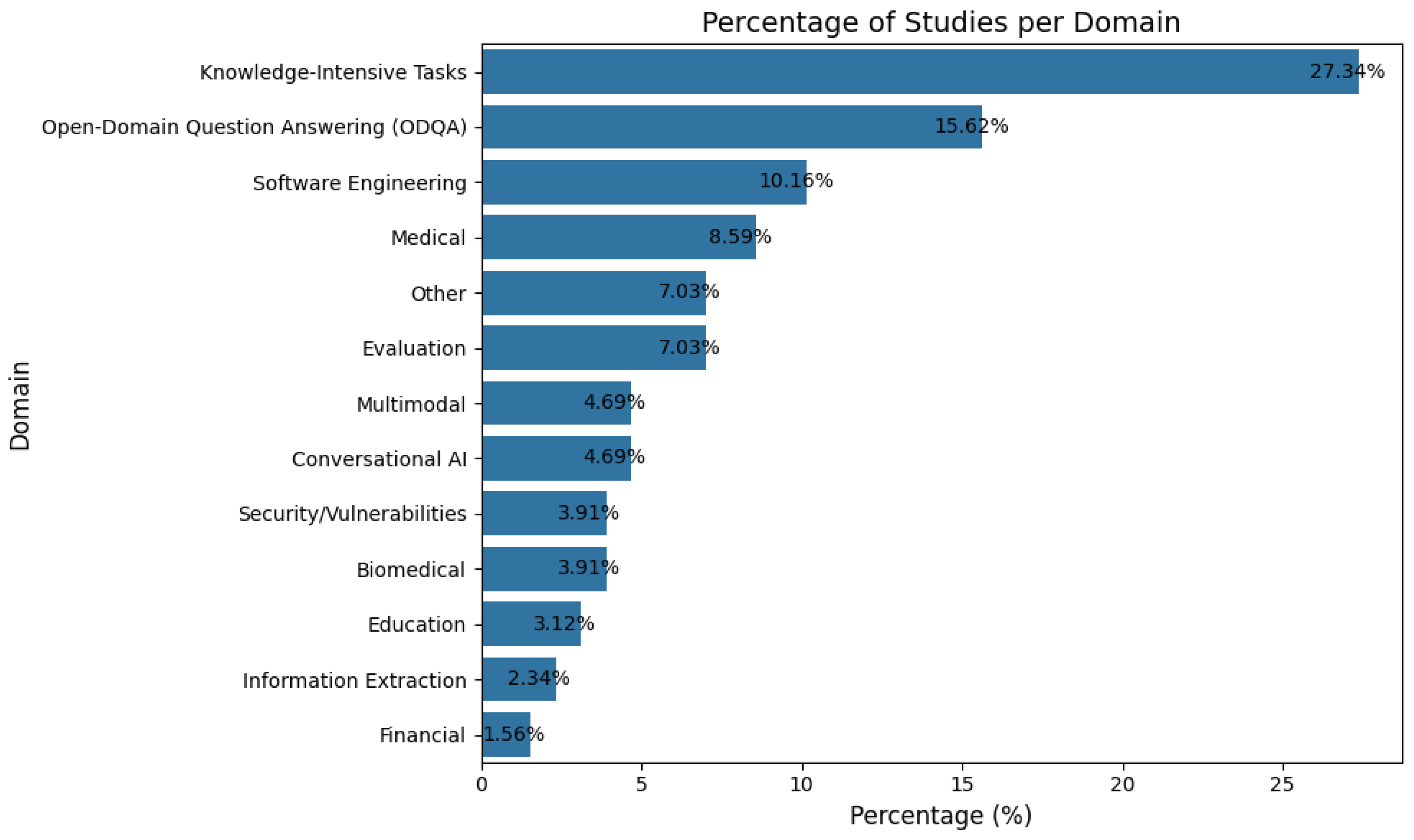 - Insufficient Emphasis or Ancillary Treatment (n= 7): Studies that incorporated RAG merely as an auxiliary component within broader investigations—such as LLM-human hybrids for marketing research, domain-specific LLM development, knowledge graph construction workflows, multimodal agent toolkits, healthcare task automation, cost-effective classification or materials modelling pipelines—without substantive and dedicated analysis of RAG itself [34,35,36,37,38,39,40].