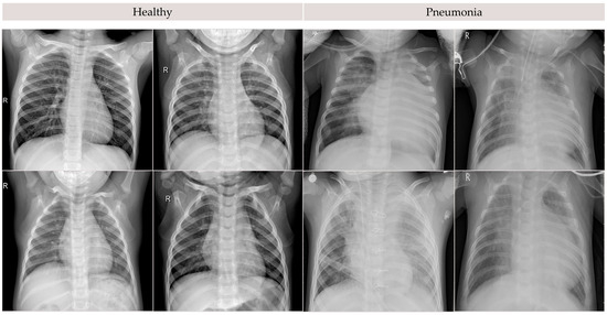 For our experiment, we utilized the open-access Chest X-ray Images (Pneumonia) repository [34], which contains X-ray images collected from pediatric patients aged one to five years at Guangzhou Women and Children’s Medical Center, Guangzhou. These images were captured as part of routine clinical care and are divided into two categories, pneumonia and healthy, with a total of 5856 images [34]. Samples of the images used are shown in Figure 2. To create the training and validation datasets, we applied a stratified random split in an 80:20 ratio, ensuring that the class distribution was maintained in both subsets. The distribution of the dataset is shown in Table 1. To prepare the data for our deep learning model, we resized all images to 224 × 224 pixels and employed a set of data augmentation techniques during preprocessing. The augmentation techniques, which include rotation, shifting, zooming, and horizontal flipping, were applied following recommendations from previous studies in medical image analysis [35,36,37]. These techniques ensure that the model learns to generalize well by artificially expanding the training set and introducing variability that the model may encounter in real-world clinical settings.