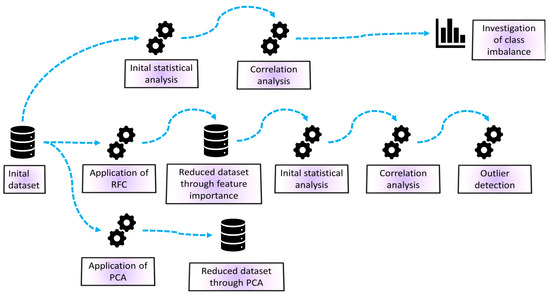 - Step 1: initial dataset statistical analysis with application of dataset preprocessing and oversampling techniques. It should be noted that at this stage three different approaches were considered i.e., the dataset with all input variables, the dataset with a reduced number of input variables by selecting those with high feature importance obtained through the Random Forest Classifier, and the reduction of dataset variables through principal component analysis. In each of these approaches, the obtained dataset will be subjected to scaling/normalization techniques and oversampling techniques to obtain balanced dataset variations.