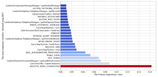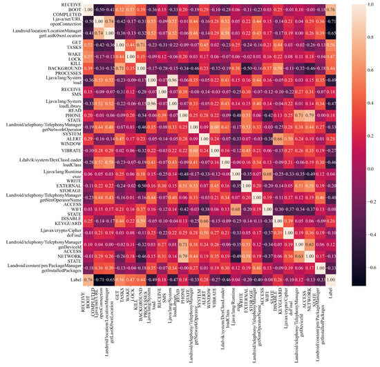 The correlations between input variables and the target variable (“Label”) shown in Figure 3 can be categorized into Positive, Negative, Moderate, Weak, and Null/Missing correlations. The positive correlations include RECEIVE_BOOT_COMPLETED (0.7604), GET_TASKS (0.5632), and WAKE_LOCK (0.4721), which suggest that malware often persists by starting at boot, exploits running application tracking, and uses wake locks to remain active for background operations. In contrast, the negative correlations include Ljava/net/URL;->openConnection (−0.7122), Landroid/location/LocationManager;->getLastKnownLocation (−0.6539), and Ljava/lang/System;->loadLibrary (−0.4708). These indicate that legitimate applications are more likely to rely on URL connections, location services, and library loading than malicious apps.
