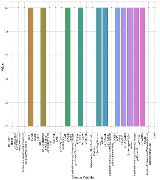 Finally, some variables, such as BODY_SENSORS (−0.002) and TRANSMIT_IR (−0.002), show negligible correlations, indicating limited use by malicious apps. Due to the large number of input variables, boxplot analysis and outlier detection were avoided, as even focusing on outliers resulted in excessive clutter. All input variables have a range between 0 and 1, meaning scaling and normalization are unnecessary. However, to evaluate their impact on classification performance, these techniques will still be applied in this study.