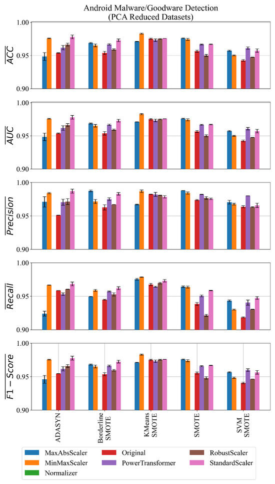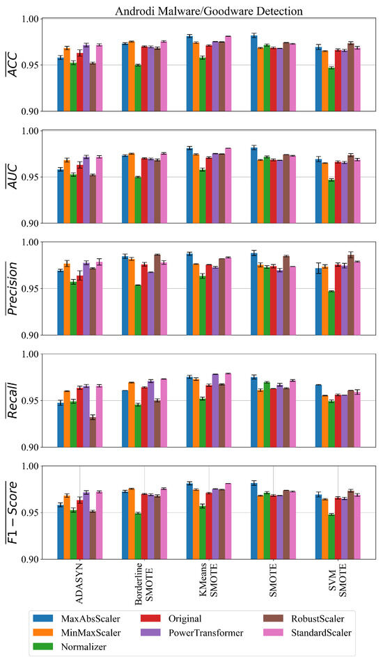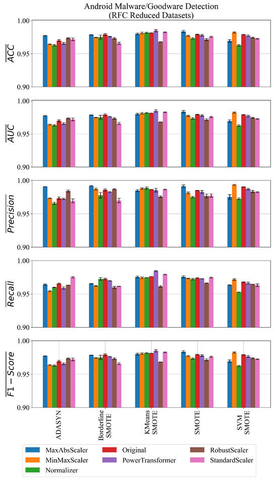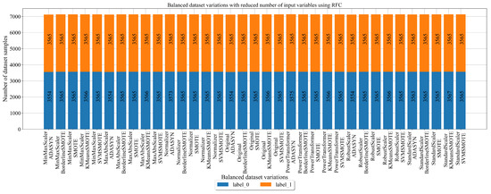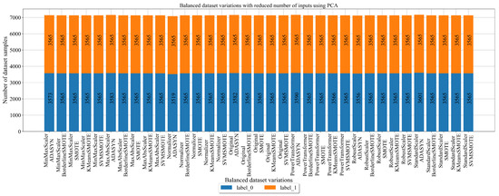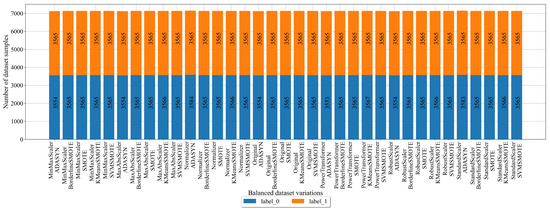 Class imbalance was addressed using oversampling techniques. The minority class (label_0) needed to be increased from 899 samples to match the 3565 samples of the majority class (label_1). Random undersampling was avoided as it would have significantly reduced the number of malware samples (label_1), potentially leading to overfitting. Various oversampling methods, including ADASYN, BorderlineSMOTE, KMeansSMOTE, SMOTE, and SVMSMOTE, were applied successfully across datasets with all input variables, reduced variables via RFC, and reduced variables via PCA. While ADASYN and KMeansSMOTE achieved near balance between classes, BorderlineSMOTE, SMOTE, and SVMSMOTE ensured perfect balance. These oversampling techniques yielded consistent performance improvements, regardless of scaling or normalization methods applied prior to oversampling.