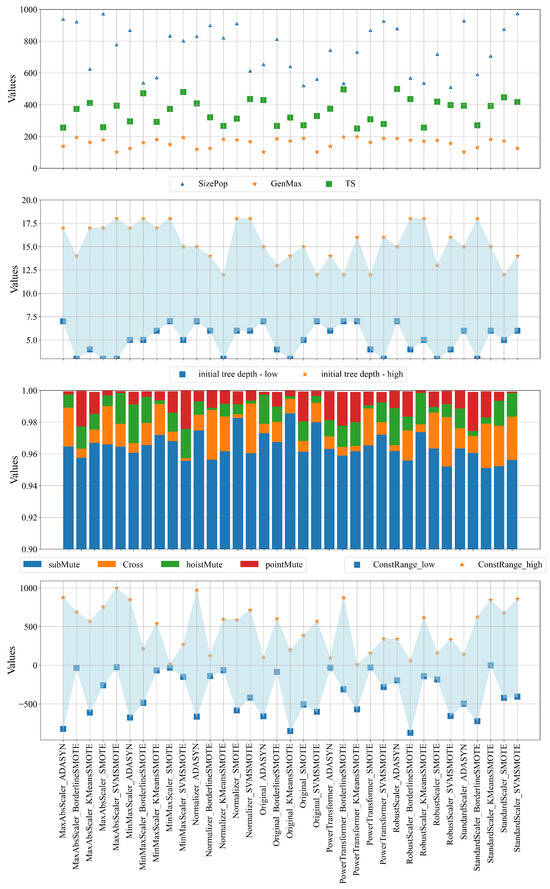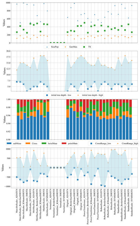 - Feature selection and representation—the table shows a reduced dataset consisting of 23 input variables selected using RFC feature importance. These features are represented in GPSC as symbolic variables (, , ⋯, ).