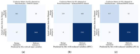 The SEs trained on balanced datasets with all input variables demonstrated strong classification performance, particularly on datasets processed with MaxAbsScaler + KMeansSMOTE, MaxAbsScaler + SMOTE, and PowerTransformer + KMeansSMOTE. These combinations achieved high accuracy (ACC), precision, recall, AUC, and F1-scores. Other combinations, such as MinMaxScaler + ADASYN and StandardScaler + SMOTE, produced balanced precision and recall but slightly lower ACC and AUC. In contrast, SEs trained on Normalizer + SVMSMOTE and RobustScaler + ADASYN showed relatively lower performance due to reduced recall and AUC. Overall, the best results were achieved with MaxAbsScaler + SMOTE or MaxAbsScaler + KMeansSMOTE, which provided excellent classification metrics with minimal variability. While StandardScaler + SMOTE and PowerTransformer + SMOTE achieved higher precision, they had lower recall. For balanced performance, MinMaxScaler + ADASYN and RobustScaler + KMeansSMOTE were viable alternatives.