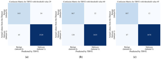 The CM shown in Figure 21a showed that TBVE with an optimal threshold value of 29 (Figure 20a) have successfully classified 3520 out of 3565 samples as malware while 45 samples were misclassified as benign. The same TBVE successfully classified 845 out of 899 samples as benign with 54 samples misclassified 54 samples as malware. The CM shown in Figure 21b showed that TBVE with an optimal threshold value of 60 has successfully classified 3435 out of 3565 samples as malware with 130 samples misclassified as benign. The same TBVE has successfully classified 867 out of 899 samples as benign with 32 misclassified as malware. In Figure 21c the CM of TBVE with optimal threshold value of 45 is shown and this TBVE has successfully classified 3478 out of 3565 samples as malware with 87 misclassified. The TBVE has successfully classified 887 out of 899 samples as benign with 12 samples misclassified as malware.