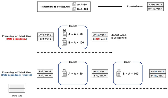 This dependency problem can be prevented by separating Tx0 and Tx1 into two blocks, as shown at the bottom of Figure 1. Key ‘A’ is updated to be 50 by Tx0 in Block 0. Then, in Block 1, Tx1 reads ‘A’ as 50 (since ‘A’ has been updated by Tx0 in Block 0) and writes ‘B’ to be 150, which is the expected result. However, this solution uses two blocks instead of one block, doubling the processing time (assuming each block takes the same processing time). The example shows us how data dependency is a significant bottleneck to speed-up in Hyperledger Fabric.