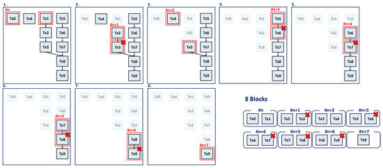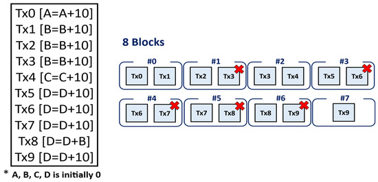 Figure 5 shows how the conventional Hyperledger Fabric method processes the example transaction set. For comparison with our proposed methods, if a transaction fails due to key overlap, the failed transaction is immediately detected and resubmitted on the next block. Transactions are processed in chronological order, where the dependency between each transaction is not considered as the conventional Hyperledger Fabric transaction processing method. Initially, Tx0 and Tx1 are processed in the first block. Afterward, Tx2 and Tx3 are processed in the same block, but only Tx2 is reflected into the network due to key collision. Tx3 is not reflected due to a key conflict and must be processed again in the next block. As a result, Tx3 and Tx4 are processed in the third block. While Tx5 and Tx6 are processed in the fourth block, Tx6 will not be reflected due to key overlap with Tx5. The rest of the transactions will all be reflected one by one due to key overlap. As a result, 8 blocks are used to process ten transactions.