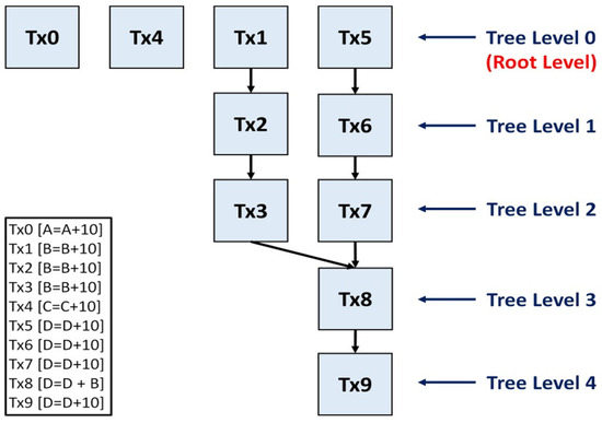Figure 4 shows the dependency tree generated with the previous example sequence from Figure 2. Consider the example in Figure 4, where transactions Tx0 to Tx9 will be added chronologically. Tx0 and Tx1 will be added to tree level 0. Since Tx2 has the same key ‘B’ as Tx1, a tree height of 1 will be added, and Tx2 will be added above Tx1 with tree level 1. An arrow will be drawn between Tx1 and Tx2 to show that data dependency is in place. Tx3 with key ‘B’ will be above Tx2. Tx4 has key ‘C’, which does not overlap with the existing ones; therefore, it will be added to tree level 0. Tx5, Tx6 and Tx7, all with key ‘D’, will be added on different tree levels for the same reason as Tx1, Tx2 and Tx3. Tx8 has keys ‘B’ and ‘D’ and will be added above Tx3 and Tx7, with two arrows representing the data dependency. Tx9 will be added above Tx8 to complete the dependency tree.