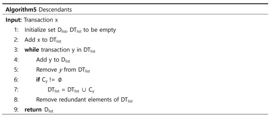 The pseudocode for the Grafting algorithm is shown in Figure 10, where Tlist stands for the transaction list that represents the memory pool of unprocessed transactions and where Rlist represents the root list of transactions on the root level of the dependency tree. Qcount represents a query count, a variable necessary to count transactions that perform read-only functions since these transactions are not included in the block processing. D represents the descendant list, W the write set, R the read set, C the child set, and P the parent set. All the transactions in the memory pool Tlist are sorted in ascending order of time to primarily process transactions of the fastest requested. Transactions in Tlist are sorted through a comparison process one by one, generating a tree structure to organize the transactions into a dependency tree. For the specific transaction, all the descending transactions are brought up for the comparison process. If a transaction’s write set is identical to the read and write set of a transaction being compared, the former transaction becomes the parent node, whereas the latter becomes the child node, forming a tree structure.