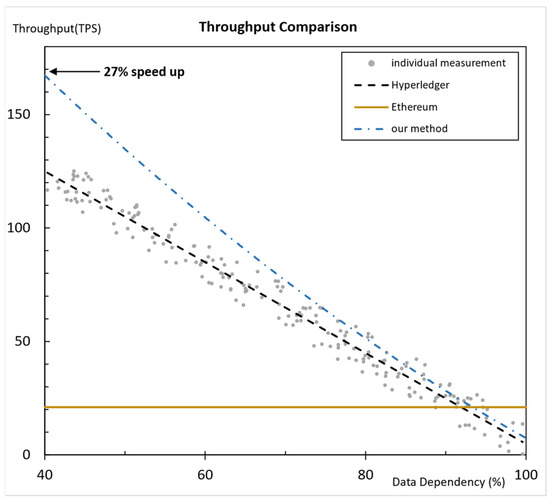 However, the performance of the conventional Hyperledger Fabric rapidly degrades as the dependency increases. Figure 15 compares the performance of the P2P Energy Trading System on the conventional Hyperledger Fabric [8], Ethereum blockchain and our method as the dependency varies from 40% to 100%. The performance of the private Ethereum blockchain is shown as a solid line for reference in Figure 15 and stays constant over varying dependency since the transactions are executed in a sequential manner. The performance of the conventional Hyperledger Fabric for the same P2P Energy Trading System is shown as a broken black line (----), while the performance of our dependency reduction method is shown as a broken blue line (-ㆍ-ㆍ-). Our method exceeds the conventional Hyperledger Fabric by as much as 27% (Figure 15).