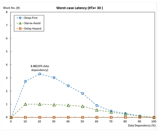 Figure 19 shows the average worst-case latency for all our proposed methods compared with the conventional Hyperledger. With the graph, we can figure out that Deep-First has the maximum worst-case latency, while the other methods tend to show lower values. The graph shown in Figure 19 clearly shows the trade-off with the Deep-First, where significant speed development is achieved by taking maximized height control with the dependency tree; however, there is the inevitable occurrence of data starvation. The difference between the three methods is easily distinguishable when the transaction collision rates are below 50%. This is because, at low collision rates, the overall height of the dependency tree created by the random set of transactions will tend to be low. Transactions processed based on height priority will affect the original sequence even more since the transactions will be proceeded ahead due to the higher priority of height, altering the original sequence. The results with the Delay-Hazard showed superior performance in preventing data starvation, where none occurred at all the collision probabilities. This is because instead of pulling the order according to the height values, transactions are only added to the remaining spaces of the block compared with the conventional Hyperledger. Another significant result would be the worst-case latency of Starve-Avoid. Although at low collision rates, it tends to show higher worst-case latency than Delay-Hazard, it consistently manages to minimize the worst-case latency by one, which would have been higher by applying Deep-First. The Starve-Avoid method manages to handle the trade-off between the other two methods. It would be preferred as the most well-balanced method for submitting delayed sets of transactions.
