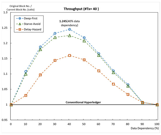 Average throughput depends on the data dependency ratio (the number of transactions is 40).