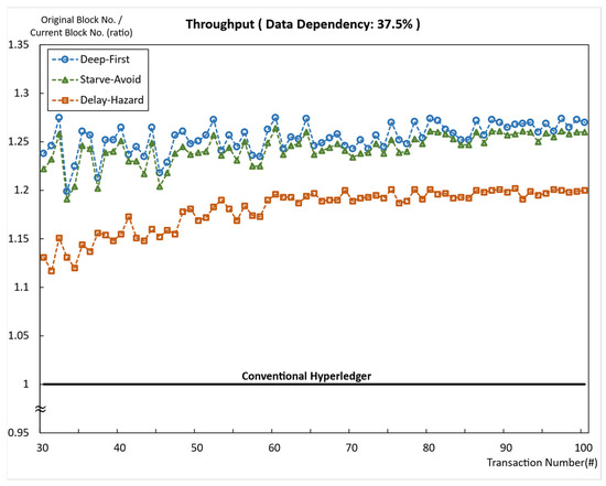 Figure 9 shows the comparison of all the transaction processing methods. The transaction in each block indicates that it is submitted to the Hyperledger Fabric network. The time delay takes place in Hyperledger Fabric for resubmitting failed transactions to the next block. At the same time, the delay also takes place in our proposed method for updating the dependency tree right after every transaction submission process. All the methods showed faster processing speed than the conventional Hyperledger Fabric method by using fewer blocks to process the example transaction set. Through the comparison, Deep-First showed optimal performance by using five blocks to process all the transactions. However, this method showed the lowest performance in terms of data starvation occurrence. From this example, we can infer that the speed and data starvation are correlated with each other.