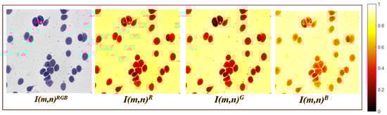 An input example with blood cells (erythrocytes and leukocytes); is presented in real color, while the color channels are represented in false color.