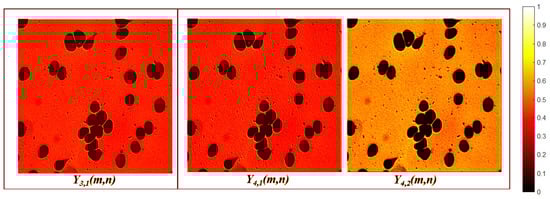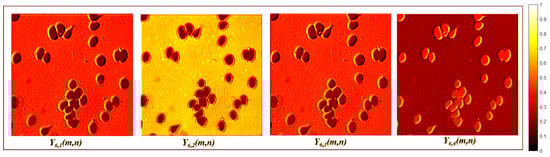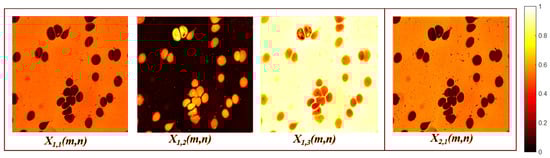 The second block of encoder layers begins with a depthwise convolution, defined by Equation (3), with and no resizing (). Layer separates the foreground into two feature maps with different morphologic and gray-level patterns, as shown in Figure 5. The subsequent layers include a separable convolution, defined by Equation (4), , followed by a nearest-neighbor interpolation which generates a feature map with dimensions . The output of this block creates four feature maps, each with distinct orientations and morphological features, as shown in Figure 6.