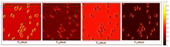 The input is a color image with a size of , where represents the spatial resolution. This resolution was selected because according to our experiments it is sufficient to represent the morphology of biological entities in histological, blood smear, and microbiological culture samples. Figure 2 shows an example of a microscopic sample image containing blood cells, where is the red channel, is the green channel, and is the blue channel.