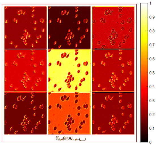 The bottleneck suppresses the background and identifies the biological entities labeled by the GT through two convolution layers and an upsampling layer. The first bottleneck layer consists of a depthwise convolution defined by Equation (3), with no resizing (). Figure 7 shows that produces four feature maps with different orientations, morphologies, and grayscale levels. The subsequent layer includes a separable convolution , defined by Equation (4), followed by an upsampling operation which generates feature tensors with dimensions . Figure 8 illustrates how produces nine feature maps with different orientations, morphologies, and grayscale levels.