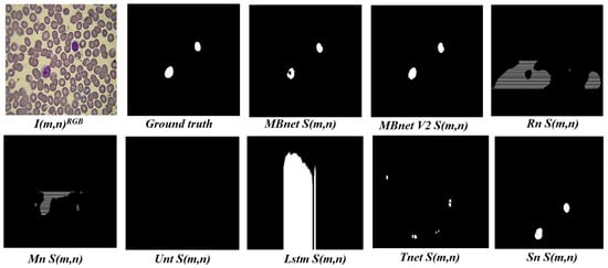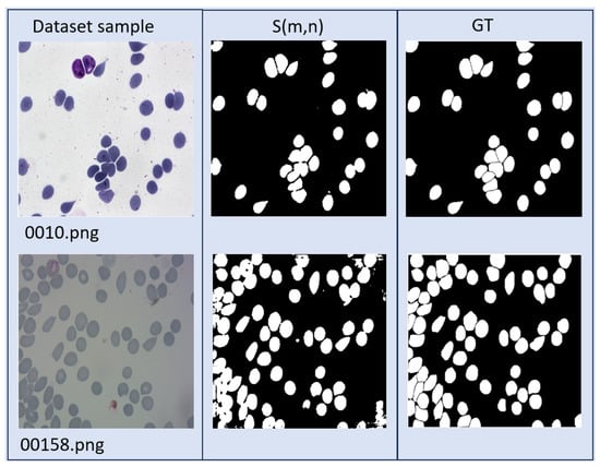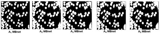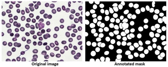 This dataset, presented in [30], contains 1328 high-resolution peripheral blood images acquired with a microscope, of which 1169 are used for training and 159 for testing. The foreground for this dataset is the blood cells. Each image has its corresponding GT, consisting of red and white blood cells, where each cell has its own GT, as shown in Figure 11. This dataset was selected to compare MBnet with other methods proposed in the literature and to perform cross-validation.