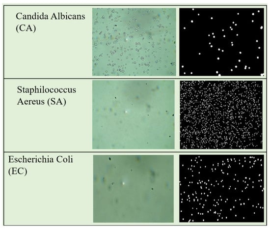 The Bacteria and Yeast Complete Samples Dataset (BYCS) contains 1500 images of culture plate samples, which are microscopy-prepared media for the growth of microorganisms. The foreground for this dataset includes bacteria and yeast acquired by a microscope at 40× magnification on a fresh smear. The dataset is divided into 500 images of Staphylococcus Aaureus (SA) cultures, 500 images of Candida Albicans (CA) cultures, and 500 images of Escherichia Coli (EC) cultures. These microorganisms were selected because they represent the primary morphologies of microorganisms, namely, coccus, bacilli, and yeast-like morphologies; SA represents the coccus morphology, EC the bacillus morphology, and CA the yeast morphology. Figure 12 shows an example of each microorganism culture and their respective GTs. BYCS was selected in order to evaluate how MBnet performs in microbiological quantification and segmentation tasks involving large numbers of microorganisms within microscopic raw images.