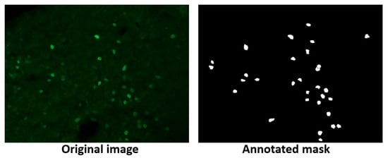 The FNCv2 dataset [32] was published in 2024 and contains 1874 fluorescent microscopy images with nuclei and cytoplasm of rodent neuronal cells stained with various markers to emphasize their anatomical and functional characteristics. Of these images, 750 include their corresponding GT, while the remaining images are unlabeled. Figure 14 shows an image and its respective GT. FNCv2 was selected to test MBnet with neural samples where only certain elements must be segmented and where the staining technique can change the color of the sample. The FNCv2 dataset was published recently, and several research works are utilizing it.