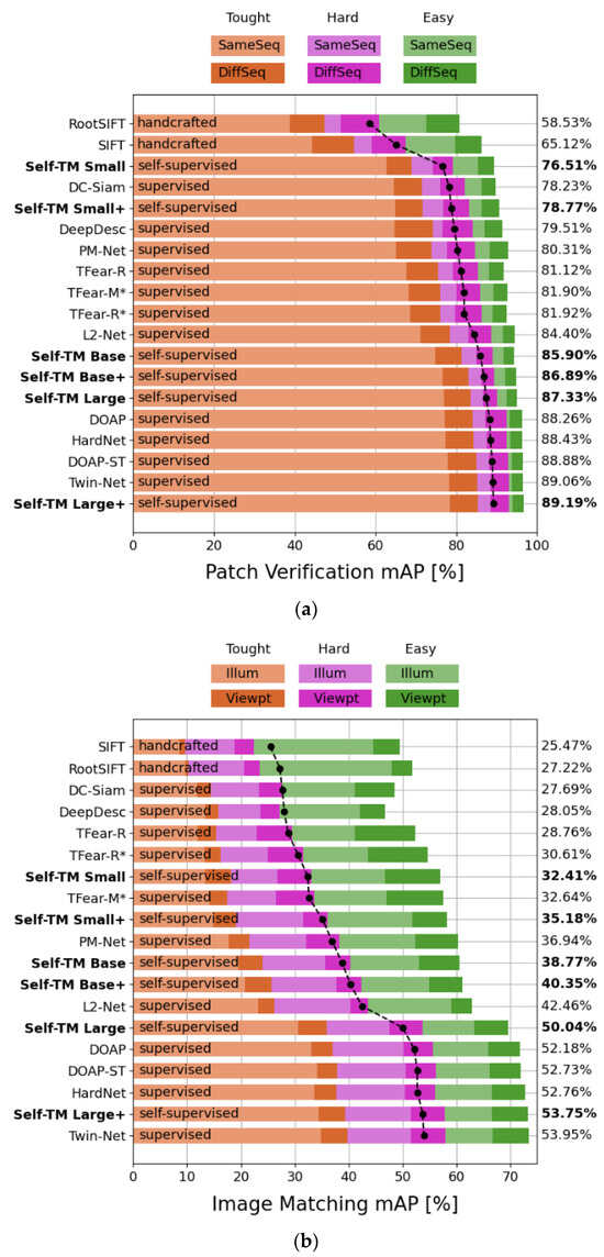 Despite the smaller number of parameters in Self-TM Base, an increased accuracy was observed in each of the three tasks: patch verification, image matching, and patch retrieval. The best result using a model trained on HPatches with color and geometric augmentations shows an increase in accuracy by 2.96% (from 84.39 to 86.89) in patch verification, by 15.68% (from 34.88 to 40.35) in image matching and by 5.61% (from 60.61 to 64.01) in patch retrieval.