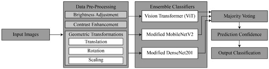 The variable in Equation (3) represents the class with the most votes. It uses different classifiers, including Vision Transformer (ViT), modified MobileNetV2, and modified DenseNet201. These models are integrated, each giving its probabilistic estimations. The class label with the most votes among these predictions is then selected as the final classification for the instance, ensuring robust and accurate results through collective decision-making.