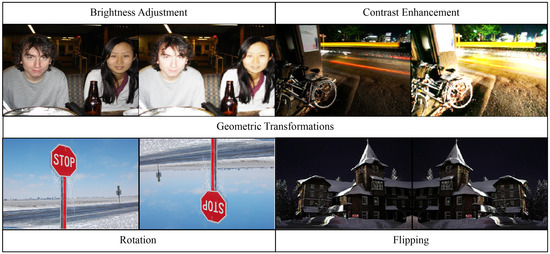 These images are subjected to contrast enhancement, brightness adjustment, and geometric transformations during preprocessing to enhance their diversity and quality. Figure 2 illustrates the effects of contrast enhancement and luminance adjustment. In the first row, it is clear that these modifications do not significantly transform the input data; rather, they improve the brightness and contrast, thereby increasing the visibility of the objects. This improvement facilitates the proposed model’s improved efficacy. Furthermore, the second row of Figure 2 illustrates the application of geometric transformations, including image rotation and inverting. These transformations enhance the dataset by increasing its variability without sacrificing the quality of the images, thereby guaranteeing the model has reliable and robust inputs.