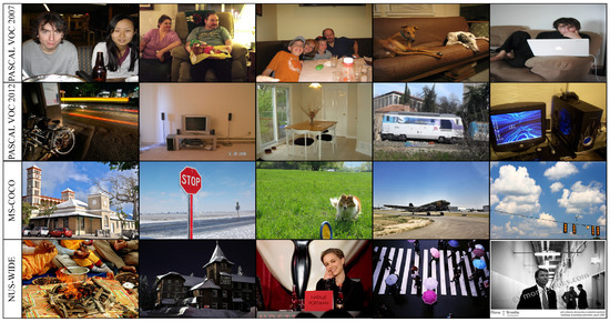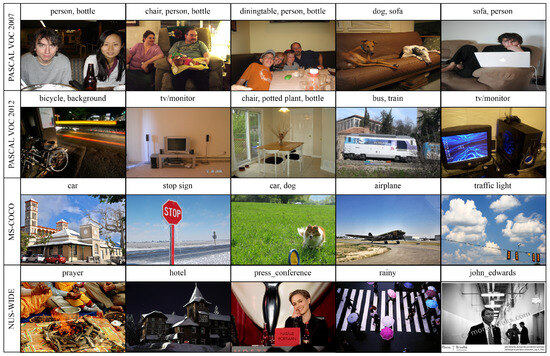 Multi-label image classification remains another research area in computer vision that provides accurate predictions of multiple labels per image. The second type is PASCAL VOC 2007 (Dataset A) [62], which is widely recognized as quite complex, especially regarding image classification and object localization. It consists of 5011 training images and 4952 validation images. Another related set is PASCAL VOC 2012 (Dataset B) [63], with 11,540 training images and 10,991 testing images. There are twenty object categories in both datasets, such as person and animal, vehicle, and some household objects. MS-COCO (Dataset C) [64] is another large dataset for multi-label image classification, which has 122,218 images in total with 80 categories on average, and each image has 2.9 labels. It also shuffled the breakdown into 82,081 training images and 40,137 validation images. The NUS-WIDE (Dataset D) [65] set was initially constructed from 269,648 images obtained from the Flickr website with 81 tags. After removing the URLs, 200,000 images are available in the dataset, with 2.4 labels per image on average. Sample images of each dataset are shown in Figure 6.